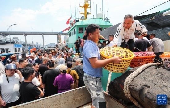 當(dāng)日,在浙江省舟山市普陀區(qū)舟山國際水產(chǎn)城碼頭,出海的漁船歸來,商戶們聞“鮮”而至。工人把卸下來的梭子蟹運(yùn)往水產(chǎn)城內(nèi),準(zhǔn)備銷往各地市場(chǎng)。