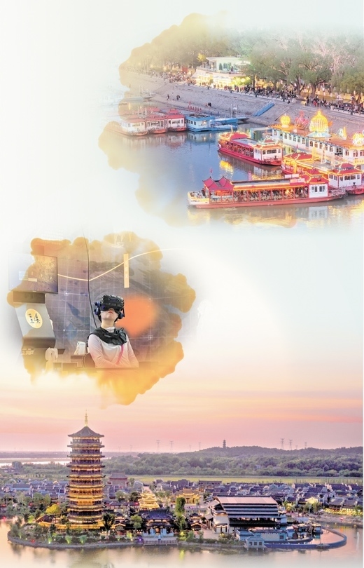 上圖:哈爾濱松花江畔,燈火璀璨、人流如織。施 覺(jué)攝 中圖:“尋境敦煌——數(shù)字敦煌沉浸展”中,游客借助VR設(shè)備游覽莫高窟。新華社記者 郎兵兵攝 下圖:晚霞映襯下的長(zhǎng)沙銅官窯古鎮(zhèn)。長(zhǎng)沙銅官窯文化旅游度假區(qū)供圖