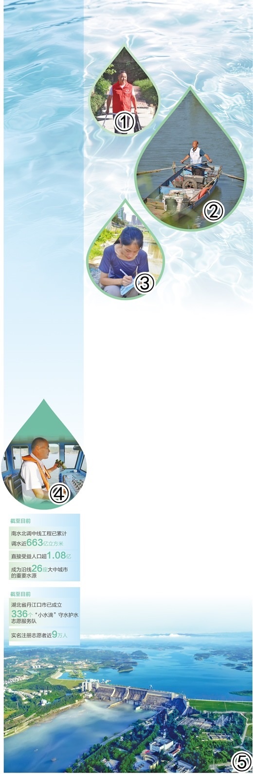 圖①:涂青海在巡線時撿拾垃圾。段 浩攝 圖②:蔣德新在巡護。丹江口市委宣傳部供圖 圖③:廖思盈在記錄水質(zhì)采樣數(shù)據(jù)。漢江師范學院供圖 圖④:肖安山在駕駛清漂船。鄖陽區(qū)委宣傳部供圖 圖⑤:丹江口水庫鳥瞰。丹江口市委宣傳部供圖 數(shù)據(jù)來源:中國南水北調(diào)集團有限公司、丹江口市委宣傳部