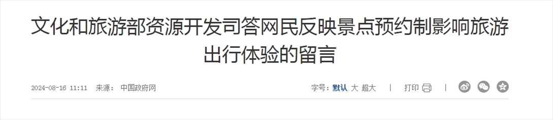 對(duì)此,文化和旅游部資源開發(fā)司8月16日在中國(guó)政府網(wǎng)上答復(fù):網(wǎng)民反映的景區(qū)預(yù)約問(wèn)題,文化和旅游部多次作出部署并提出要求,一是所有景區(qū)均保留人工窗口,最大限度滿足游客參觀游覽需求;二是在承載量容許情況下,保障臨時(shí)到訪游客和老年人等群體入園需求;三是要求常年預(yù)約空余量較大的景區(qū)不實(shí)行預(yù)約;四是實(shí)施線上購(gòu)票預(yù)約的,要求完善預(yù)約措施,優(yōu)化預(yù)約程序,盡可能減少游客個(gè)人信息采集。
