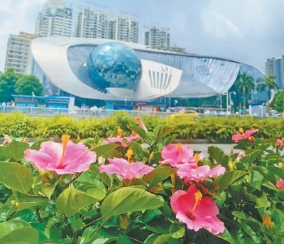 南寧市區(qū)最醒目的“朱槿花”,是位于城區(qū)核心的中國—東盟博覽會永久會址。會址主建筑頂端是一朵高49米的巨大“朱槿花”。這朵“朱槿花”是南寧市最具辨識度的地標,也是南寧開放發(fā)展的一道亮麗風(fēng)景。