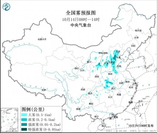 預(yù)計(jì),10月14日早晨至上午,河北中南部、北京、天津西部、山東西部、山西中東部、陜西北部、河南東北部和南部部分地區(qū)、湖北中部等地有大霧天氣,其中,河北中南部、北京西部、山西中部、陜西北部、湖北中部等地的部分地區(qū)有能見度低于500米的濃霧,局地有不足200米的強(qiáng)濃霧。中央氣象臺(tái)14日06時(shí)繼續(xù)發(fā)布大霧黃色預(yù)警。此外,14日,華北中南部、黃淮中西部、汾渭平原等地大氣擴(kuò)散條件較差,有輕至中度霾,其中,北京南部、河北西部沿山部分地區(qū)有重度霾。14日夜間起,受冷空氣影響,上述地區(qū)霧霾天氣自北向南逐漸減弱或消散。