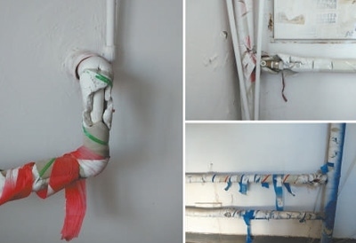 黑龍江綏化市明水縣東城社區(qū)統(tǒng)一供熱后,為防止各公用樓道單元暖氣管道散熱損失熱量,將其全都包裹上了泡沫塑料并纏上膠帶。然而,由于缺乏定期維護,目前很多樓道單元外包護熱的泡沫塑料及膠帶,都有不同程度的破損(見圖)。