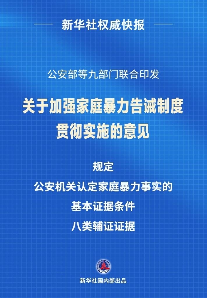 近日,公安部、中央政法委、最高人民法院、教育部、民政部、司法部、國家衛(wèi)生健康委、全國婦聯(lián)、國務(wù)院婦兒工委辦聯(lián)合印發(fā)《關(guān)于加強家庭暴力告誡制度貫徹實施的意見》。