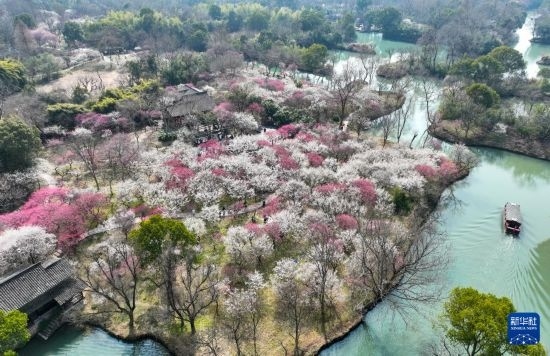 2月26日,游船經(jīng)過杭州西溪濕地一片盛開的梅林(無人機(jī)照片)。
