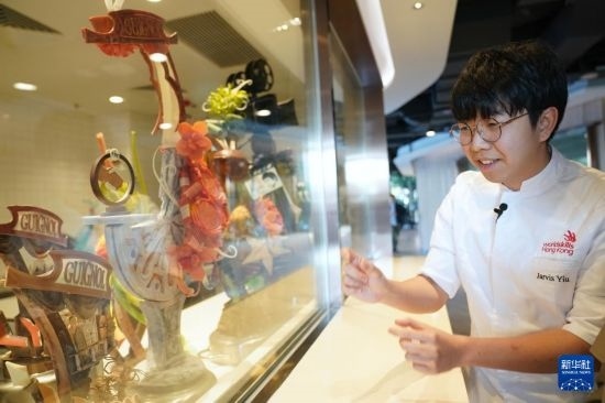 在香港國際廚藝學(xué)院西點(diǎn)廚房,姚浩民在介紹“2024年里昂世界技能大賽”西點(diǎn)制作項(xiàng)目的銀牌作品(1月15日攝)。新華社發(fā)(王申攝)