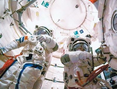 神舟十九號航天員蔡旭哲(右)、宋令東在做出艙準(zhǔn)備。