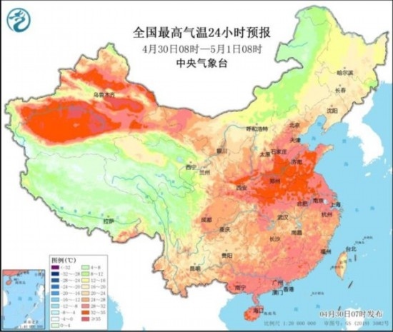 昨日,河北南部等地最高氣溫超過35℃。預(yù)計今天,華北、黃淮一帶氣溫仍較高,包括鄭州在內(nèi)的部分地區(qū)今天最高氣溫可達35℃。五一假期臨近,氣象專家提醒,假日前期全國大部地區(qū)降雨偏弱,氣溫偏高,公眾在外出游玩時注意防暑防曬。假日后期南方地區(qū)雨水增多,外出時需注意避雨和防御強對流天氣。