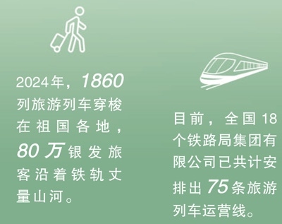 今年2月,商務(wù)部、文化和旅游部、中國國家鐵路集團(tuán)有限公司等9單位聯(lián)合發(fā)布《關(guān)于增開銀發(fā)旅游列車促進(jìn)服務(wù)消費(fèi)發(fā)展的行動(dòng)計(jì)劃》,指出要擴(kuò)容旅游列車線路和產(chǎn)品,豐富銀發(fā)旅游列車產(chǎn)品供給,建立品質(zhì)型、舒適型、普惠型產(chǎn)品體系。目前,全國18個(gè)鐵路局集團(tuán)有限公司已共計(jì)安排出75條旅游列車運(yùn)營線。一趟趟銀發(fā)列車如春日繁花次第綻放,為老年人鋪就通往詩與遠(yuǎn)方的旅途,更以流動(dòng)的風(fēng)景線激活沿線文旅消費(fèi),為推動(dòng)經(jīng)濟(jì)高質(zhì)量發(fā)展注入“銀發(fā)”新動(dòng)能。