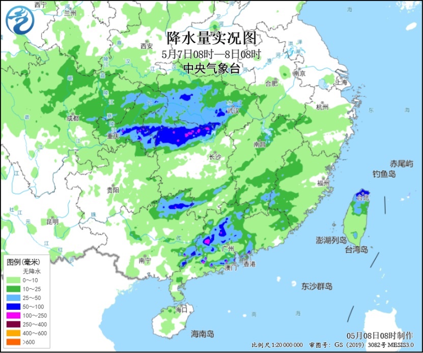 氣象監(jiān)測顯示,昨日,重慶東部、湖北西南部、湖南西北部、廣西東北部、廣東中西部及臺(tái)灣島北部等地部分地區(qū)出現(xiàn)大到暴雨,重慶彭水、湖北恩施、湖南張家界、廣東肇慶和江門等局地大暴雨(100~192毫米)。