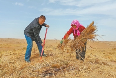 先做壓沙草方格。挖開方方正正的草方格,在四邊鋪上麥草,踩著鐵鍬,把麥草從間隙里壓進(jìn)去……一次次重復(fù),換來一排排麥草挺立,穩(wěn)住了片片流沙。