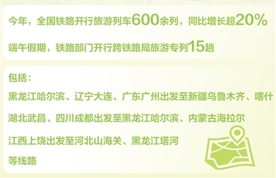 國(guó)鐵集團(tuán)數(shù)據(jù)顯示:今年全國(guó)鐵路已開行旅游列車600余列,同比增長(zhǎng)超20%。端午假期,鐵路部門開行跨鐵路局旅游專列15趟,包括從黑龍江哈爾濱、遼寧大連、廣東廣州出發(fā)至新疆烏魯木齊、喀什,湖北武昌、四川成都出發(fā)至黑龍江哈爾濱、內(nèi)蒙古海拉爾,江西上饒出發(fā)至河北山海關(guān)、黑龍江塔河等線路。