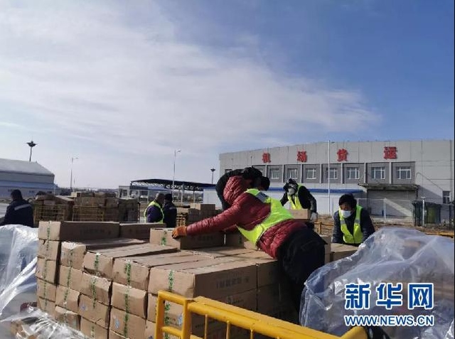 物資在呼和浩特白塔機場集結后,20多名物流公司工作人員冒著星夜寒風,在停機坪上操作打板,將物資裝機。