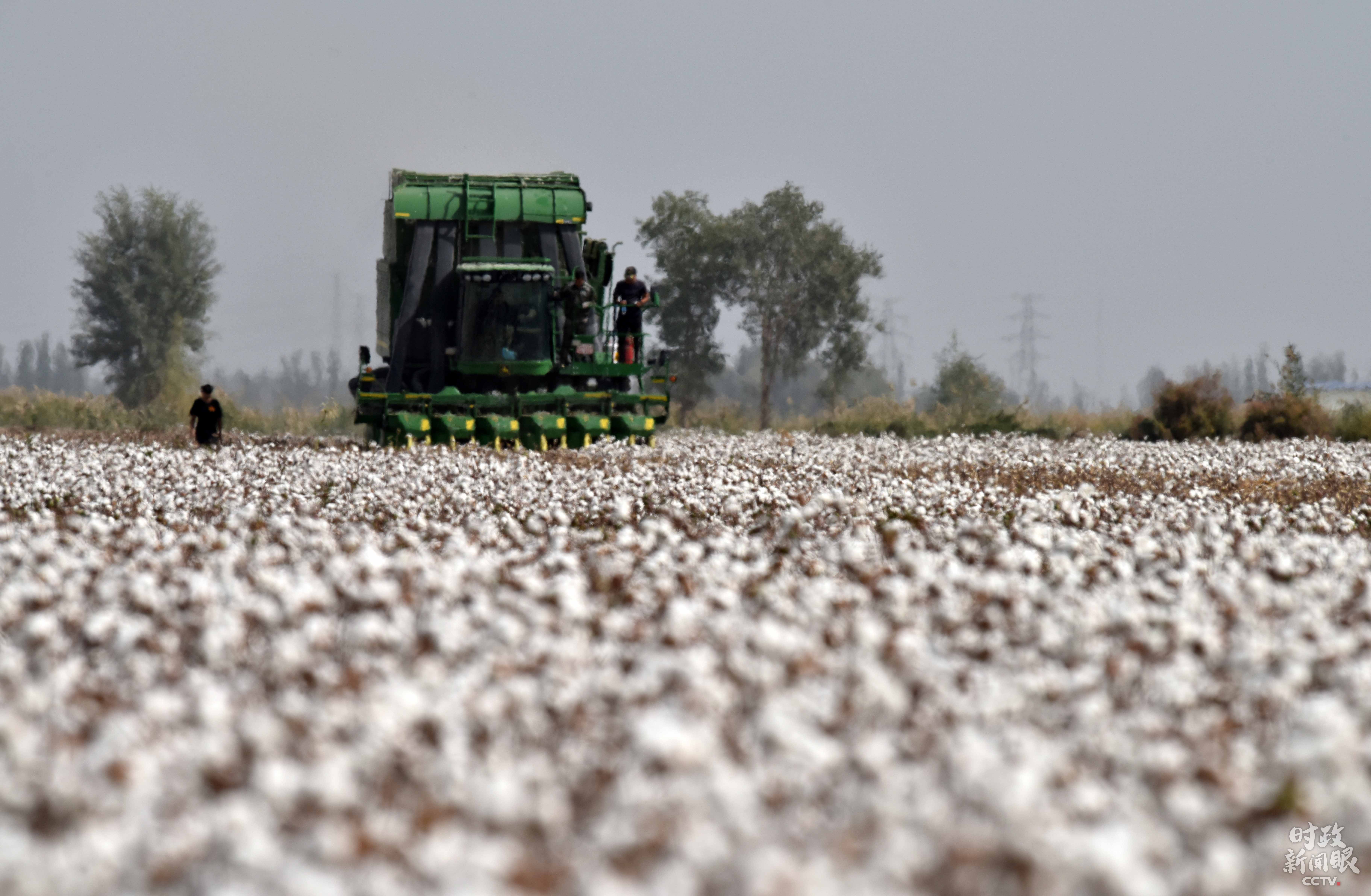 △新疆庫爾勒市普惠農(nóng)場(chǎng)內(nèi),大型采棉機(jī)正在采收棉花。