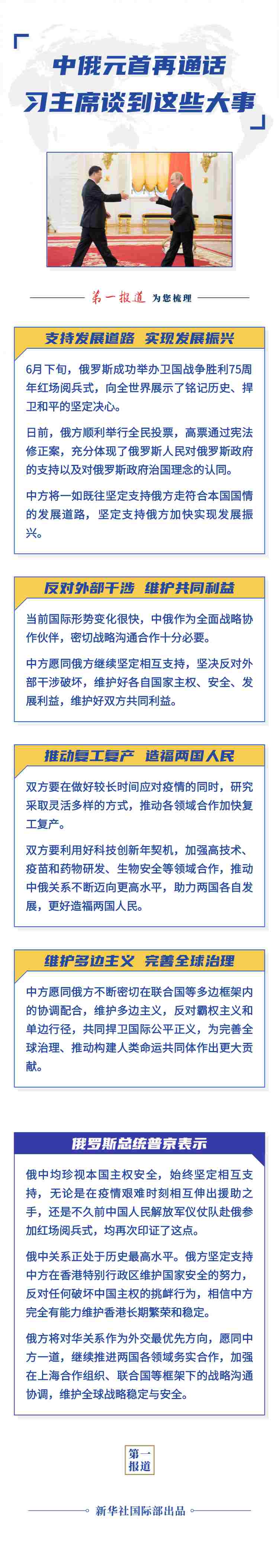 普京表示,近日俄羅斯全民投票高票通過憲法修正案,有助于維護俄長期政治穩(wěn)定,更好捍衛(wèi)國家主權(quán),反對外部干涉。俄中均珍視本國主權(quán)安全,始終堅定相互支持,無論是在疫情艱難時刻相互伸出援助之手,還是不久前中國人民解放軍儀仗隊赴俄參加紅場閱兵式,均再次印證了這點。俄中關(guān)系正處于歷史最高水平。俄方堅定支持中方在香港特別行政區(qū)維護國家安全的努力,反對任何破壞中國主權(quán)的挑釁行為,相信中方完全有能力維護香港長期繁榮和穩(wěn)定。俄方將對華關(guān)系作為外交最優(yōu)先方向,愿同中方一道,繼續(xù)推進兩國各領(lǐng)域務(wù)實合作,加強在上海合作組織、聯(lián)合國等框架下的戰(zhàn)略溝通協(xié)調(diào),維護全球戰(zhàn)略穩(wěn)定與安全。