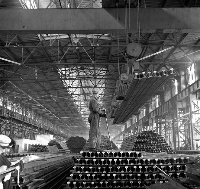“一五”期間,鞍鋼興建的第一座大型軋鋼廠生產(chǎn)能力已迅速超過設計標準。這是這個廠生產(chǎn)的大批鋼軌(攝于1957年4月)。
