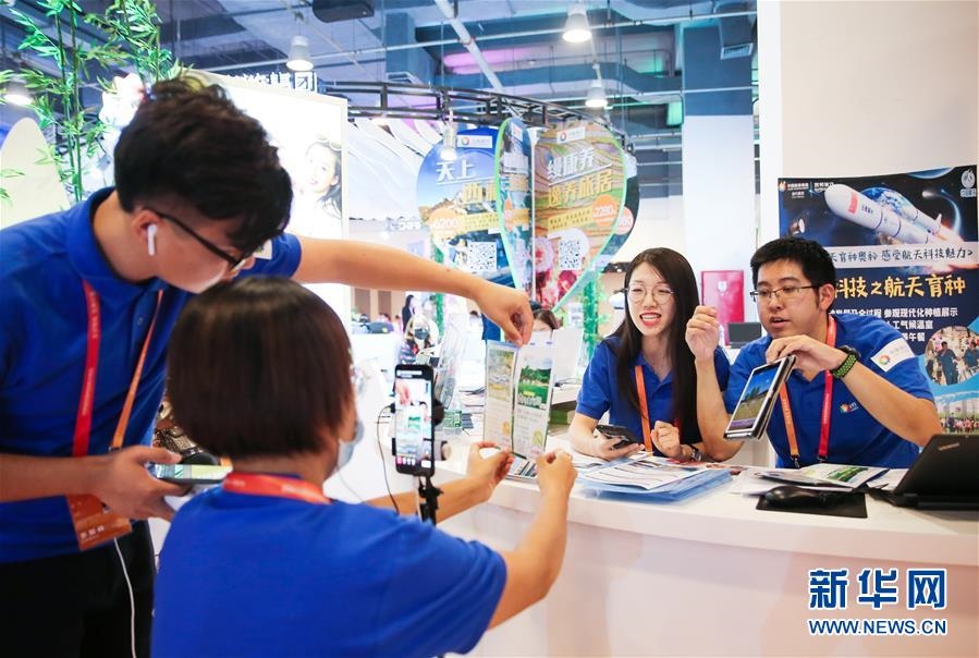 在2020年中國國際服務(wù)貿(mào)易交易會(huì)旅游服務(wù)專題展區(qū),中國旅游集團(tuán)展位的工作人員通過直播向線上觀眾介紹旅游服務(wù)產(chǎn)品(2020年9月5日攝)。新華社記者潘思危攝