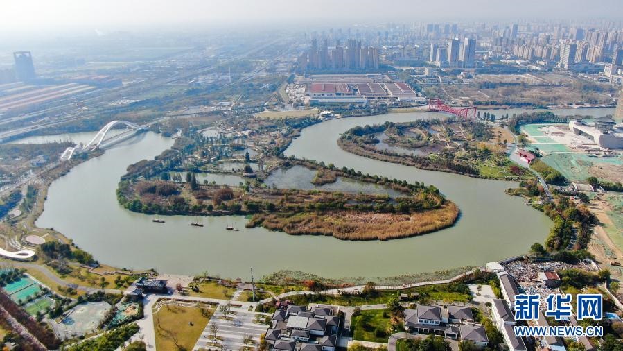 這是11月14日拍攝的江蘇省揚(yáng)州市運(yùn)河三灣生態(tài)文化公園景色(無(wú)人機(jī)照片)。新華社記者 季春鵬 攝