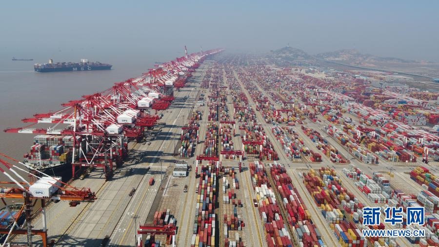 這是3月18日拍攝的上海洋山港集裝箱碼頭(無(wú)人機(jī)照片)。新華社記者 丁汀 攝
