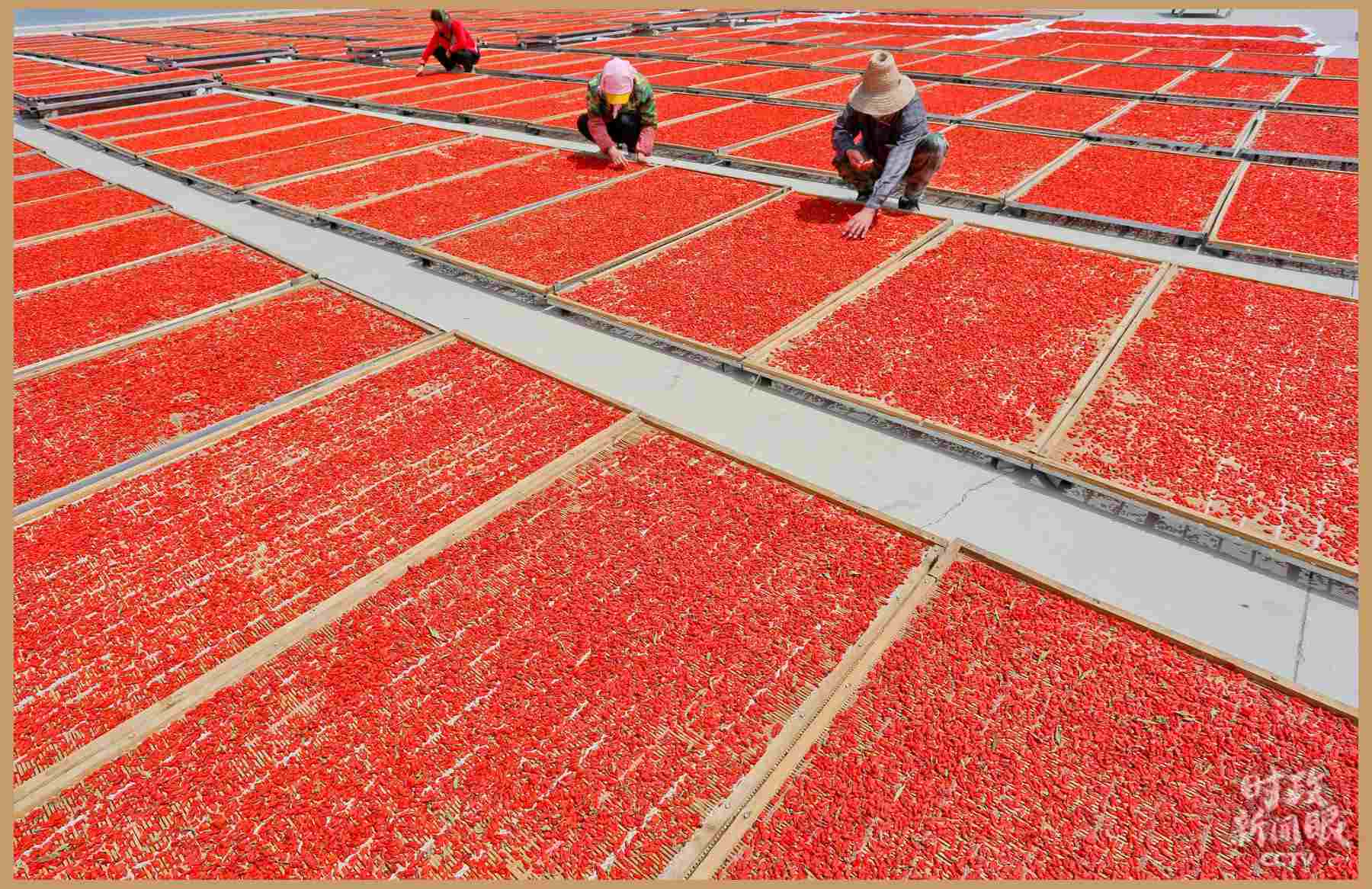 △甘肅張掖苗家堡村“扶貧車(chē)間”里,農(nóng)戶(hù)在晾曬枸杞。