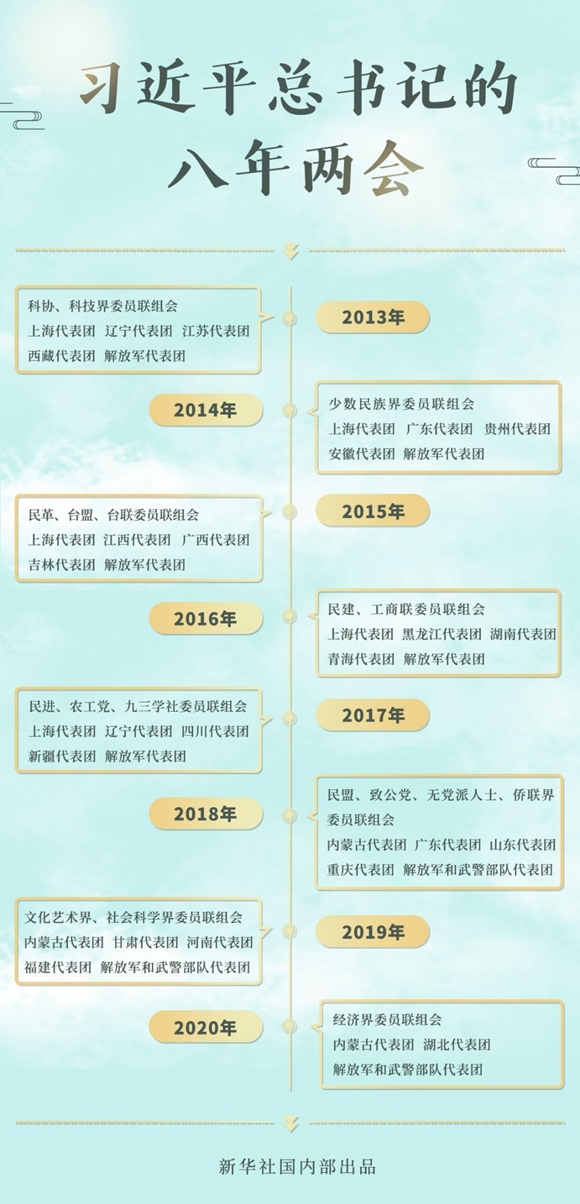 2013-2020,八年的全國兩會上,總書記46次到團組參加審議討論。交流之中,語重心長;言談之間,發(fā)人深思。