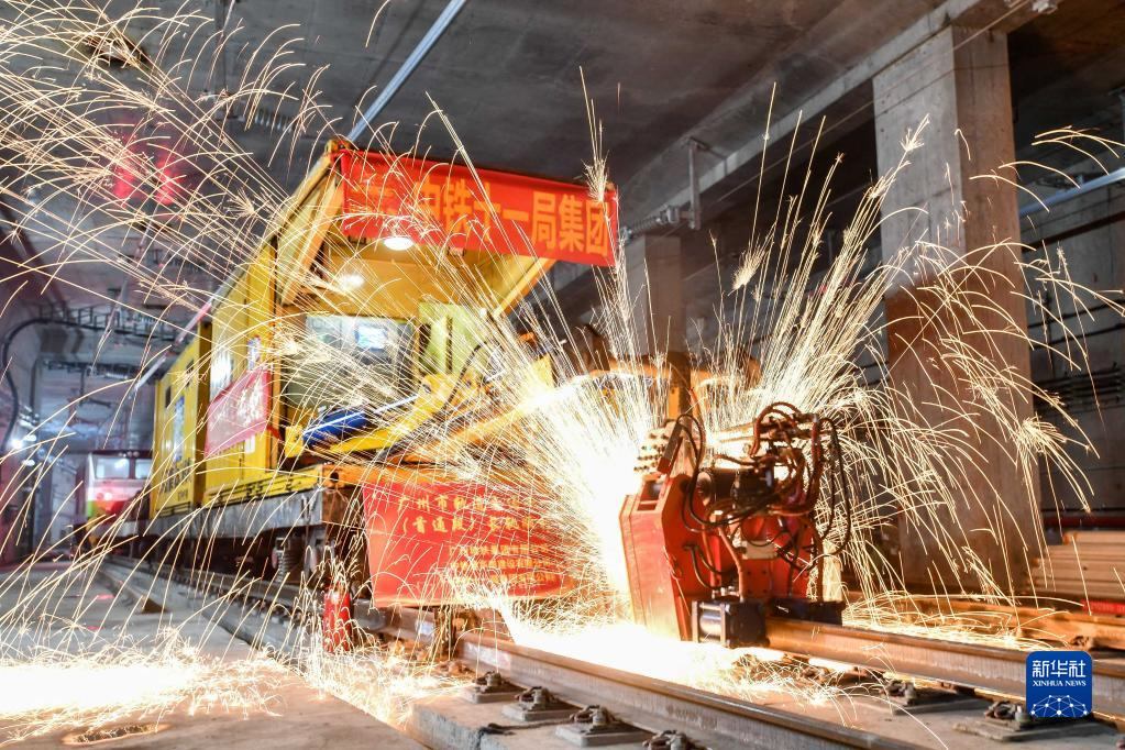 中鐵十一局軌道焊機在焊接廣州地鐵18號線首通段最后一個鋼軌接頭(4月20日攝)。新華社記者劉大偉攝