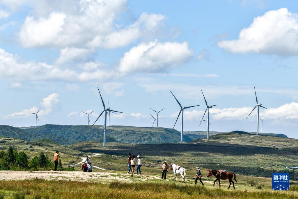 游客在貴州省龍里縣龍里大草原的風(fēng)電場(chǎng)觀光(9月21日攝)。新華社記者 楊文斌 攝