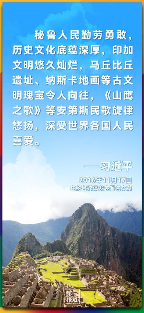 2016年對(duì)秘魯進(jìn)行國(guó)事訪問(wèn)期間,習(xí)近平主席在時(shí)任秘魯總統(tǒng)庫(kù)琴斯基的陪同下,出席了中拉文化交流年閉幕式。途中參觀《文明的長(zhǎng)河——中拉文明互鑒》圖片展時(shí),共同欣賞了中秘兩國(guó)樂(lè)隊(duì)一起演奏的中國(guó)民歌《沂蒙山歌》和秘魯民歌《山鷹之歌》。