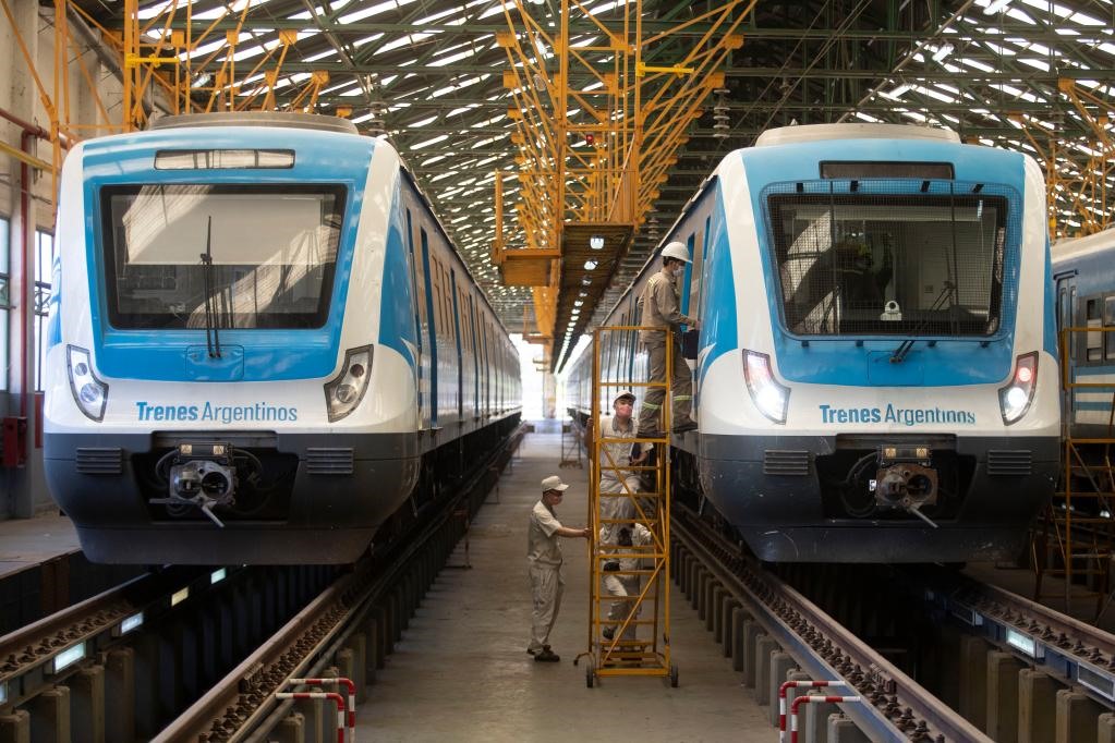 2020年11月16日,在布宜諾斯艾利斯省拉瓦約,中國(guó)和阿根廷技術(shù)人員對(duì)阿根廷城際鐵路列車(chē)進(jìn)行日常檢查。