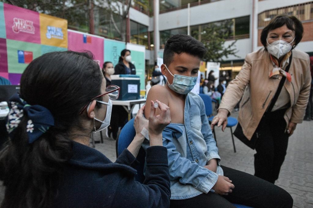 2021年9月27日,一名兒童在智利首都圣地亞哥接種科興新冠疫苗。27日起,智利開(kāi)始對(duì)6歲至11歲在校學(xué)生接種中國(guó)科興疫苗。