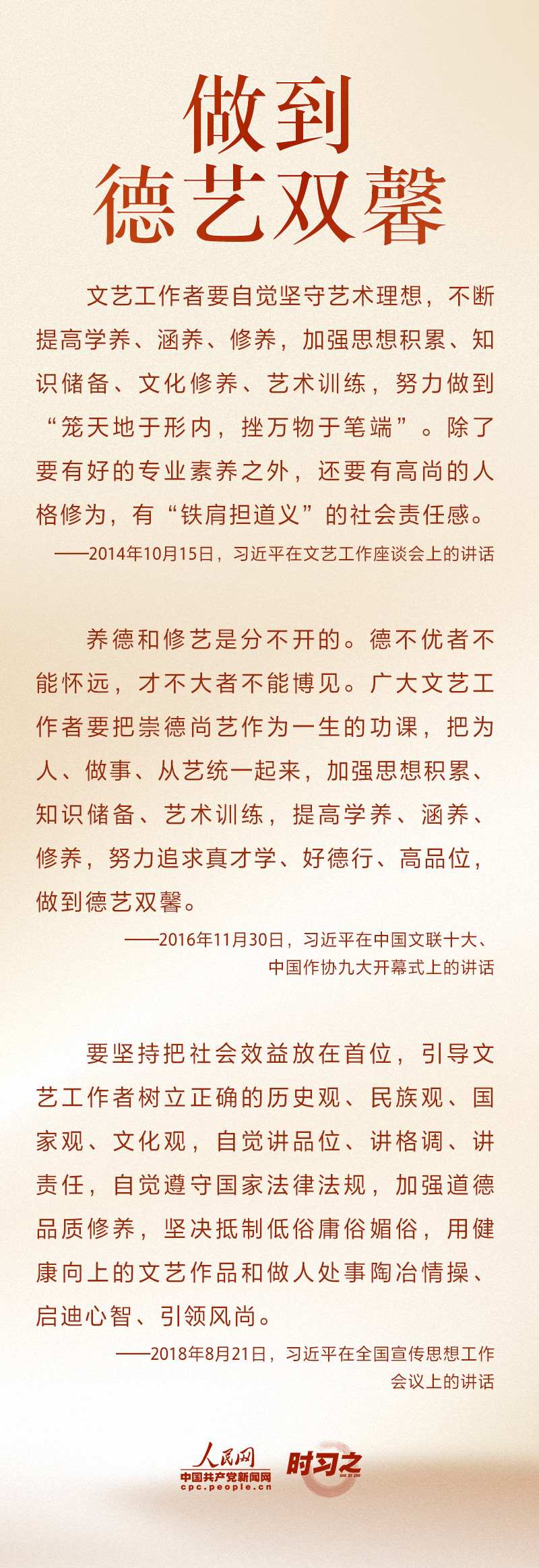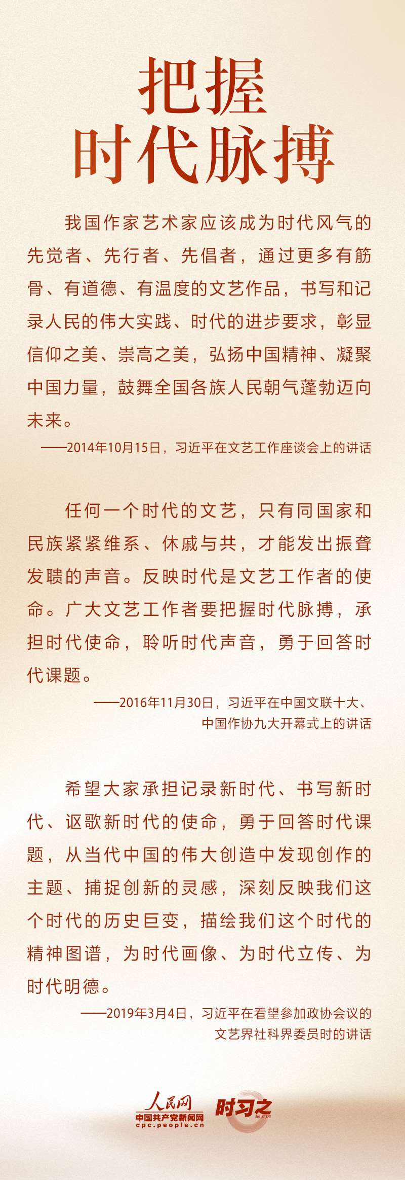 文運(yùn)同國(guó)運(yùn)相牽,文脈同國(guó)脈相連。新時(shí)代文藝工作者承擔(dān)著記錄新時(shí)代、書(shū)寫(xiě)新時(shí)代、謳歌新時(shí)代的重大使命?!拔乃囀氰T造靈魂的工程,文藝工作者是靈魂的工程師?!秉h的十八大以來(lái),習(xí)近平不斷激勵(lì)文藝工作者不辜負(fù)時(shí)代召喚、不辜負(fù)人民期待,以德服人、以文化人。