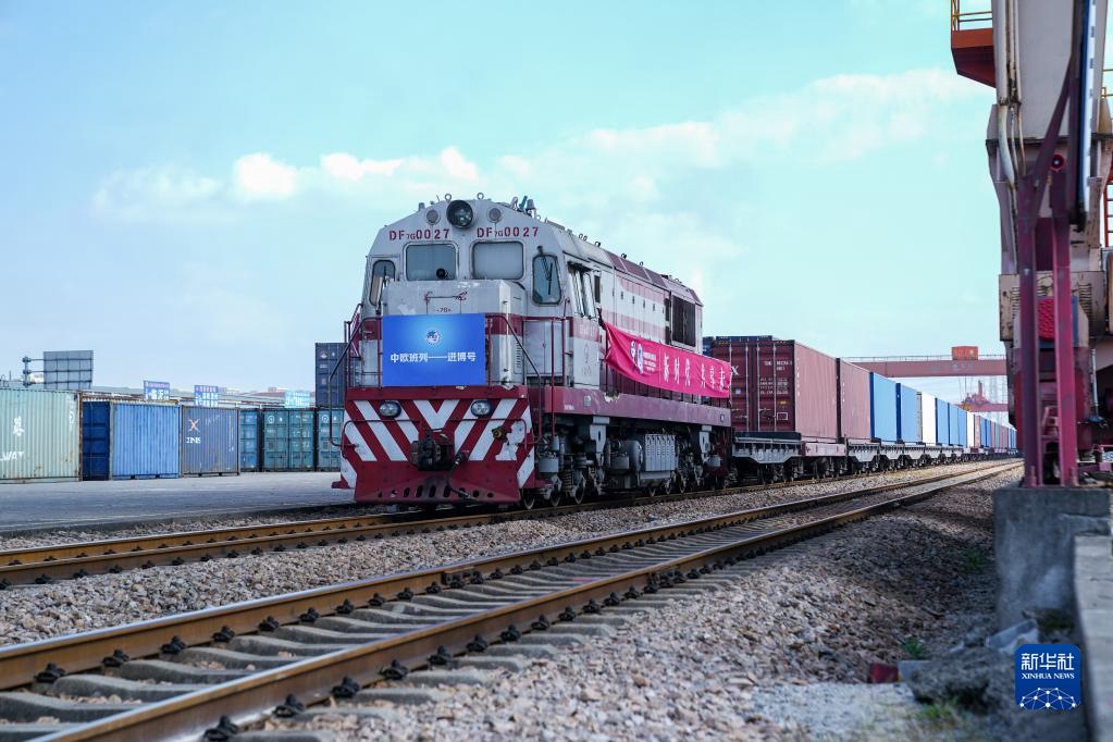 2021年10月29日,首班“中歐班列—進(jìn)博號(hào)”列車抵達(dá)上海。當(dāng)日,首班“中歐班列—進(jìn)博號(hào)”到達(dá)上海,從德國(guó)漢堡出發(fā)的該趟班列上裝載了智能真空噴射沖洗系統(tǒng)、電機(jī)零件等第四屆中國(guó)國(guó)際進(jìn)口博覽會(huì)參展展品,這也是進(jìn)博會(huì)展品首次坐中歐班列直達(dá)上海。新華社記者 丁汀 攝