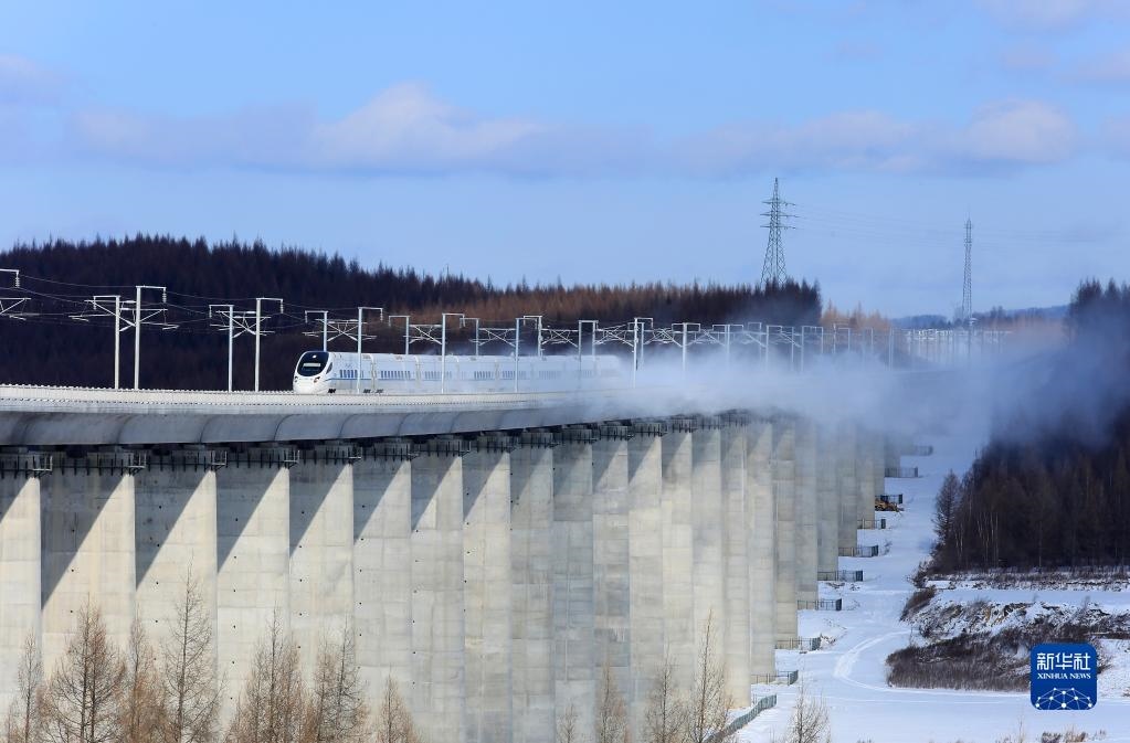 試運(yùn)行期間,高鐵列車行駛在沈佳高鐵白敦段上(2021年12月3日攝,無(wú)人機(jī)照片)。2021年12月24日,沈陽(yáng)至佳木斯高鐵長(zhǎng)白山至敦化段正式開(kāi)通運(yùn)營(yíng),長(zhǎng)白山風(fēng)景區(qū)接入全國(guó)高鐵網(wǎng),長(zhǎng)春至長(zhǎng)白山最快2小時(shí)18分可達(dá)。沈佳高鐵白敦段位于吉林省延邊朝鮮族自治州境內(nèi),設(shè)計(jì)時(shí)速250公里,由于其穿越原始森林,被譽(yù)為“森林高鐵”。新華社發(fā)(劉慎庫(kù) 攝)