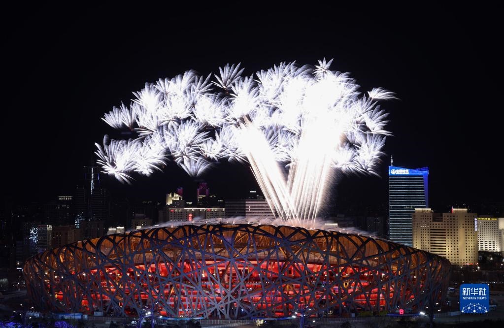 北京2022年冬奧會開幕式上的焰火表演(2月4日攝)。新華社記者 盧燁 攝