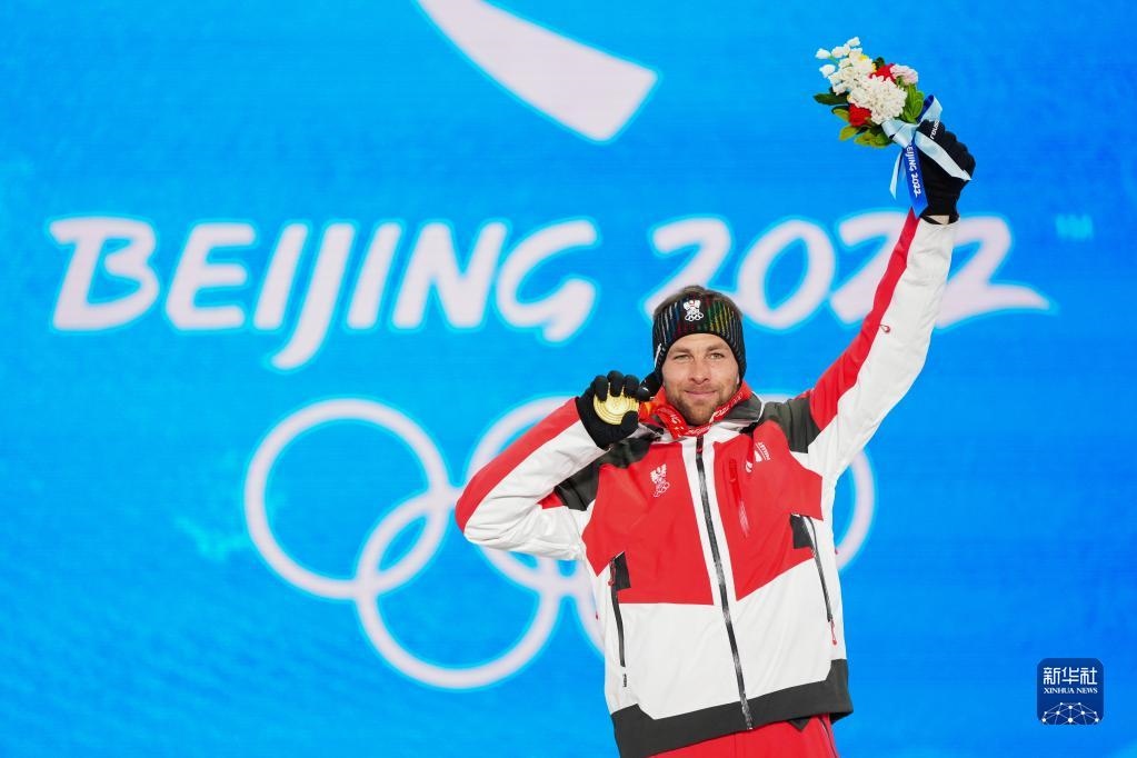 2月8日,單板滑雪男子平行大回轉(zhuǎn)比賽冠軍、奧地利選手本亞明·卡爾在獎牌頒發(fā)儀式上。新華社記者 朱崢 攝