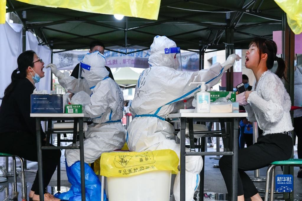 3月13日,在深圳羅湖區(qū)向西村核酸檢測(cè)點(diǎn),醫(yī)務(wù)人員為居民進(jìn)行核酸采樣。新華社發(fā)(儲(chǔ)焱攝)