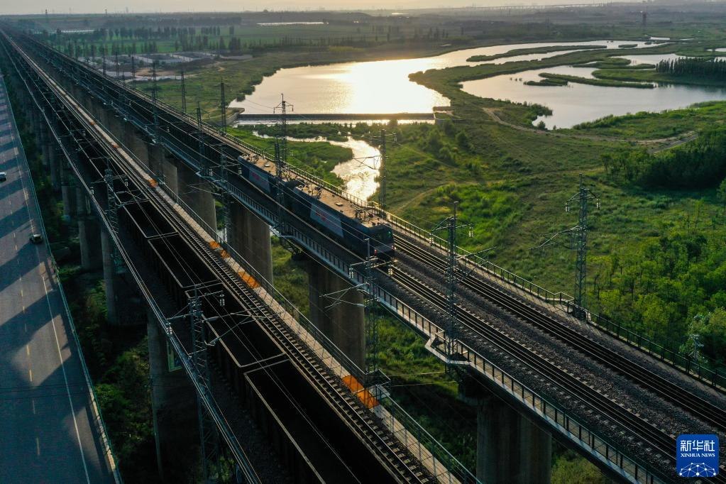 重載列車行駛在大秦鐵路上(2022年7月16日攝,無(wú)人機(jī)照片)。為做好迎峰度夏能源保供工作,中國(guó)鐵路太原局集團(tuán)有限公司在確保運(yùn)輸安全的前提下全力提升煤炭運(yùn)量。新華社記者曹陽(yáng)攝
