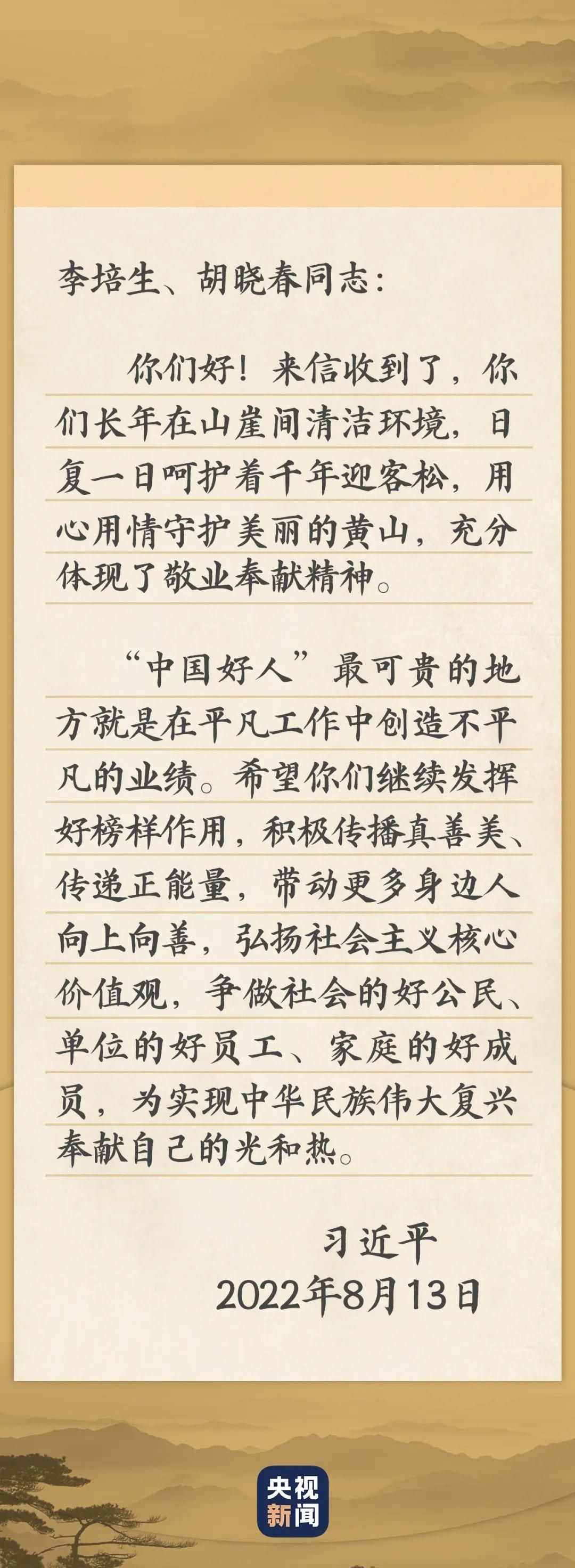 “真沒(méi)有想到習(xí)近平總書(shū)記給我們回信了,這份巨大的鼓舞不僅是給我們倆,也是給黃山的,更是給所有‘中國(guó)好人’的?!苯拥綍?shū)信的李培生和胡曉春,前行的動(dòng)力十足。