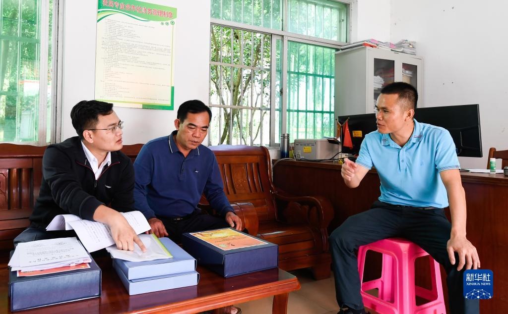 在海南省瓊中黎族苗族自治縣灣嶺鎮(zhèn)加章村委會,紀(jì)檢監(jiān)察干部(左一)在查閱鄉(xiāng)村振興及村級財務(wù)支出相關(guān)材料(2021年11月13日攝)。新華社記者 楊冠宇 攝