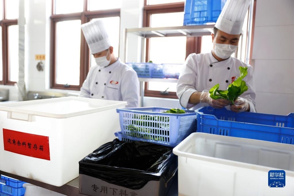 在某中央國家機(jī)關(guān)食堂,廚師將菜根等邊角余料放入暫存箱(2020年10月26日攝)。新華社記者 劉彬 攝