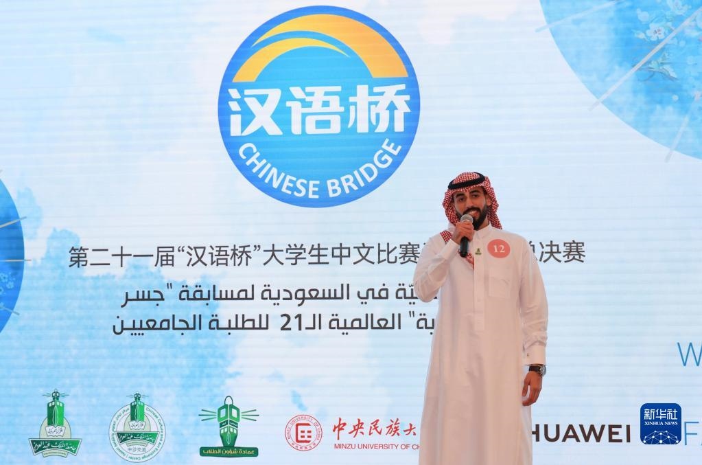 2022年7月20日,在沙特首都利雅得,第21屆“漢語(yǔ)橋”世界大學(xué)生中文比賽沙特賽區(qū)冠軍艾哈邁德·蘇萊曼在決賽中演講。新華社記者 王海洲 攝