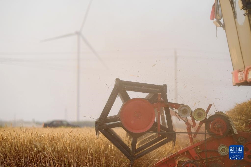 在河南省安陽市湯陰縣菜園鎮(zhèn)高標(biāo)準(zhǔn)農(nóng)田示范區(qū),收割機(jī)在麥田作業(yè)(2022年6月8日攝)。新華社記者 郝源 攝