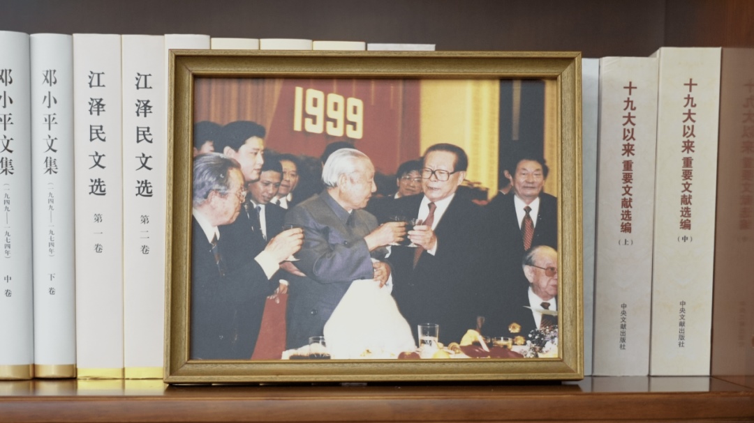 書架上擺放著一張合影。這是1999年9月30日,江澤民同志、朱镕基同志、習(xí)仲勛同志在慶祝建國五十周年招待會上。這張照片第一次出現(xiàn)在習(xí)近平總書記的書架上。