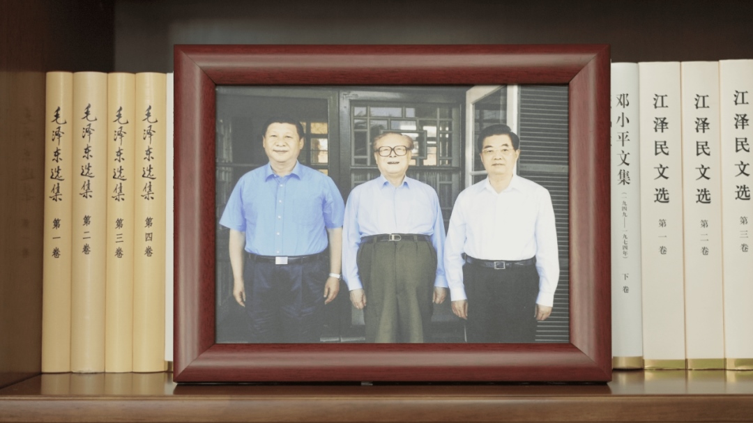 書架上還有一張習(xí)近平總書記同江澤民同志、胡錦濤同志的合影。這張照片第一次出現(xiàn)在習(xí)近平總書記的書架上。