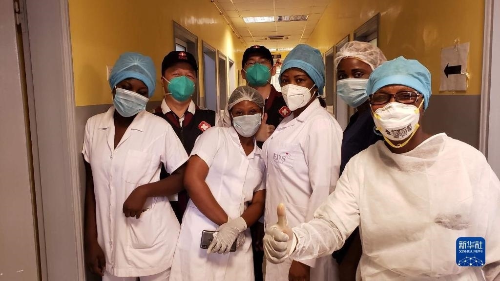 2020年5月26日,中國(guó)抗疫醫(yī)療專家組在剛果(布)首都布拉柴維爾指導(dǎo)新冠肺炎病房建設(shè)時(shí),與當(dāng)?shù)匾痪€醫(yī)務(wù)人員合影。新華社發(fā)