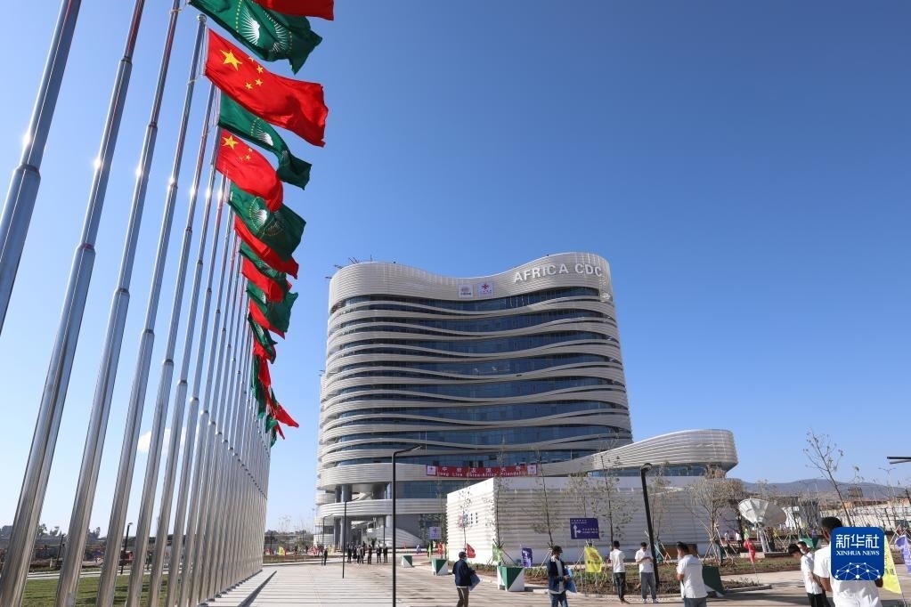 2023年1月11日,埃塞俄比亞首都亞的斯亞貝巴南郊,五星紅旗和非盟會(huì)旗迎風(fēng)飄展,中國(guó)援非盟非洲疾控中心總部(一期)項(xiàng)目竣工儀式在這里舉行。