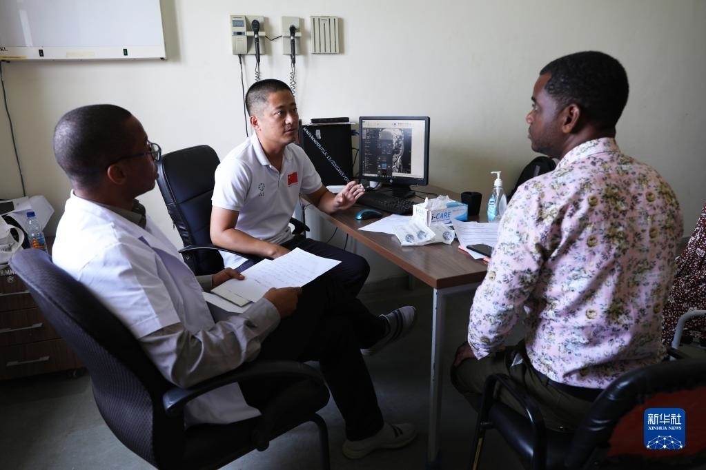 2023年2月22日,在坦桑尼亞桑給巴爾島納茲莫加醫(yī)院,中國(guó)援桑給巴爾醫(yī)療隊(duì)成員郭偉(左二)給病人看病。新華社記者 董江輝 攝