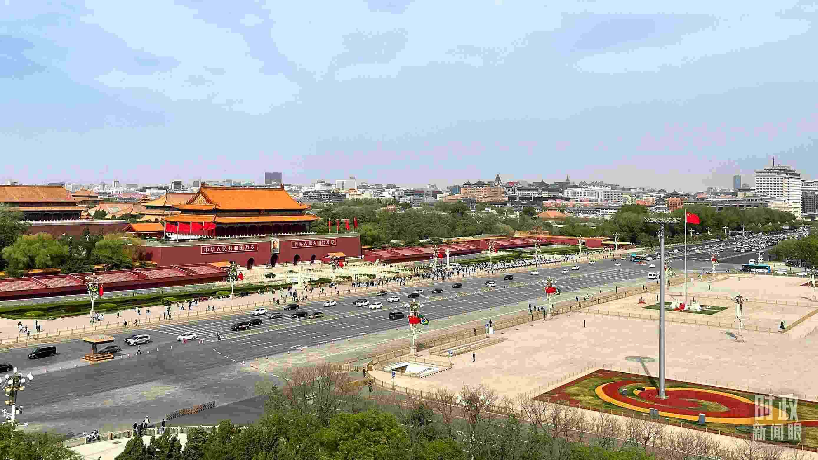 △長(zhǎng)安街兩側(cè)懸掛起中巴兩國(guó)國(guó)旗。(總臺(tái)央視記者陸泓宇拍攝)