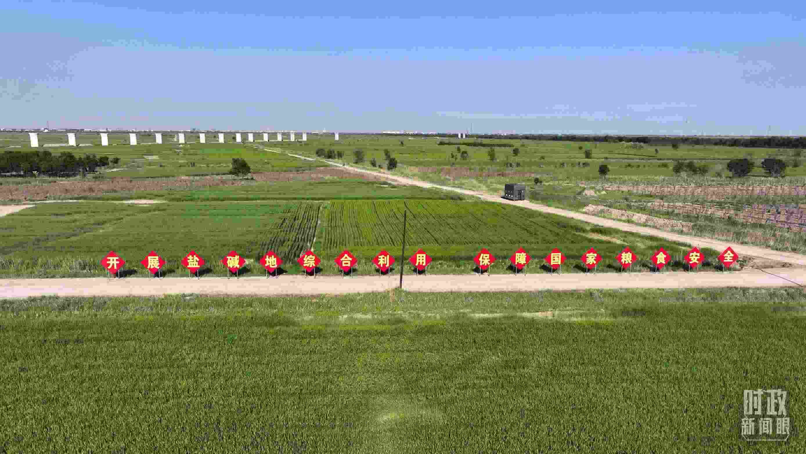 △旱堿麥田被分割成整齊劃一的綠色方塊。(總臺記者郭永良拍攝)