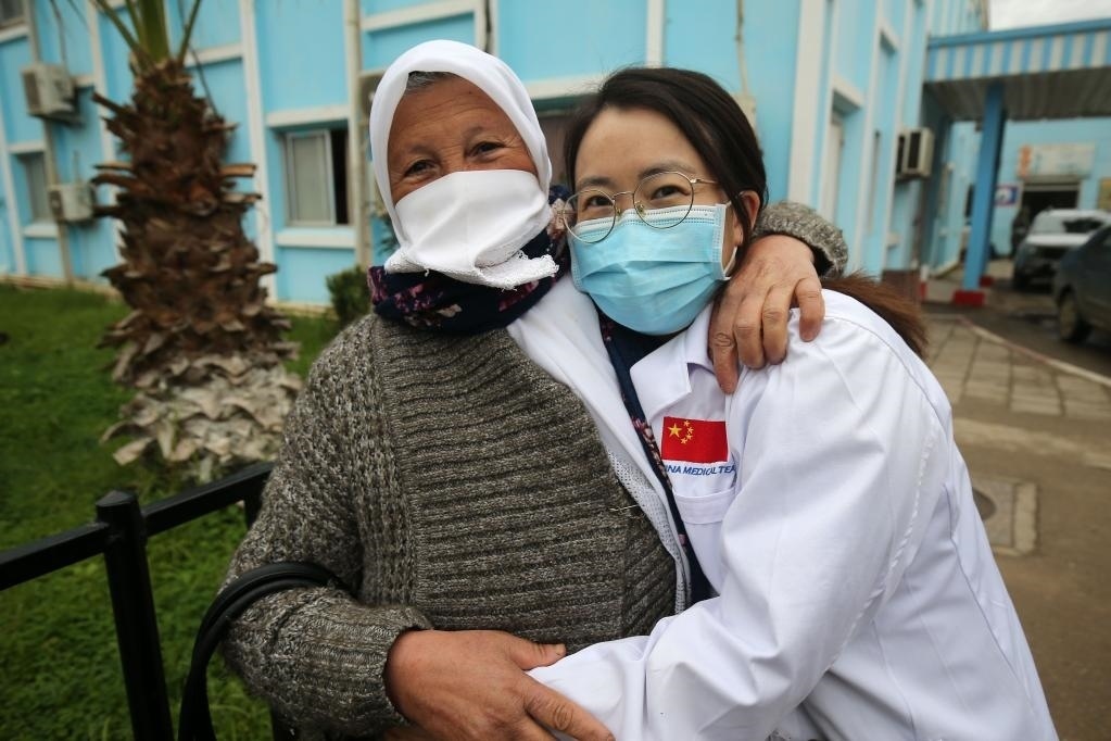 2023年2月27日,在阿爾及利亞艾因迪夫拉,63歲的阿里里·赫依拉(左)到醫(yī)院感謝中國援阿醫(yī)療隊(duì)醫(yī)生李洪玲。